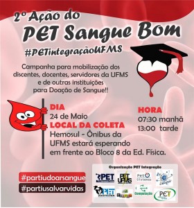 No dia 24 de maio será realizada a 2ª Ação PET-Sangue Bom cujo objetivo é abastecer o banco de sangue do Hemosul. A iniciativa é do PET-Educação Física, sob a tutoria do professor Junior Vagner Pereira da Silva, em parceria com os PETs Engenharia Elétrica, Sistemas, Materiais, Zootecnia, Química, Computação e Farmácia da Cidade Universitária.